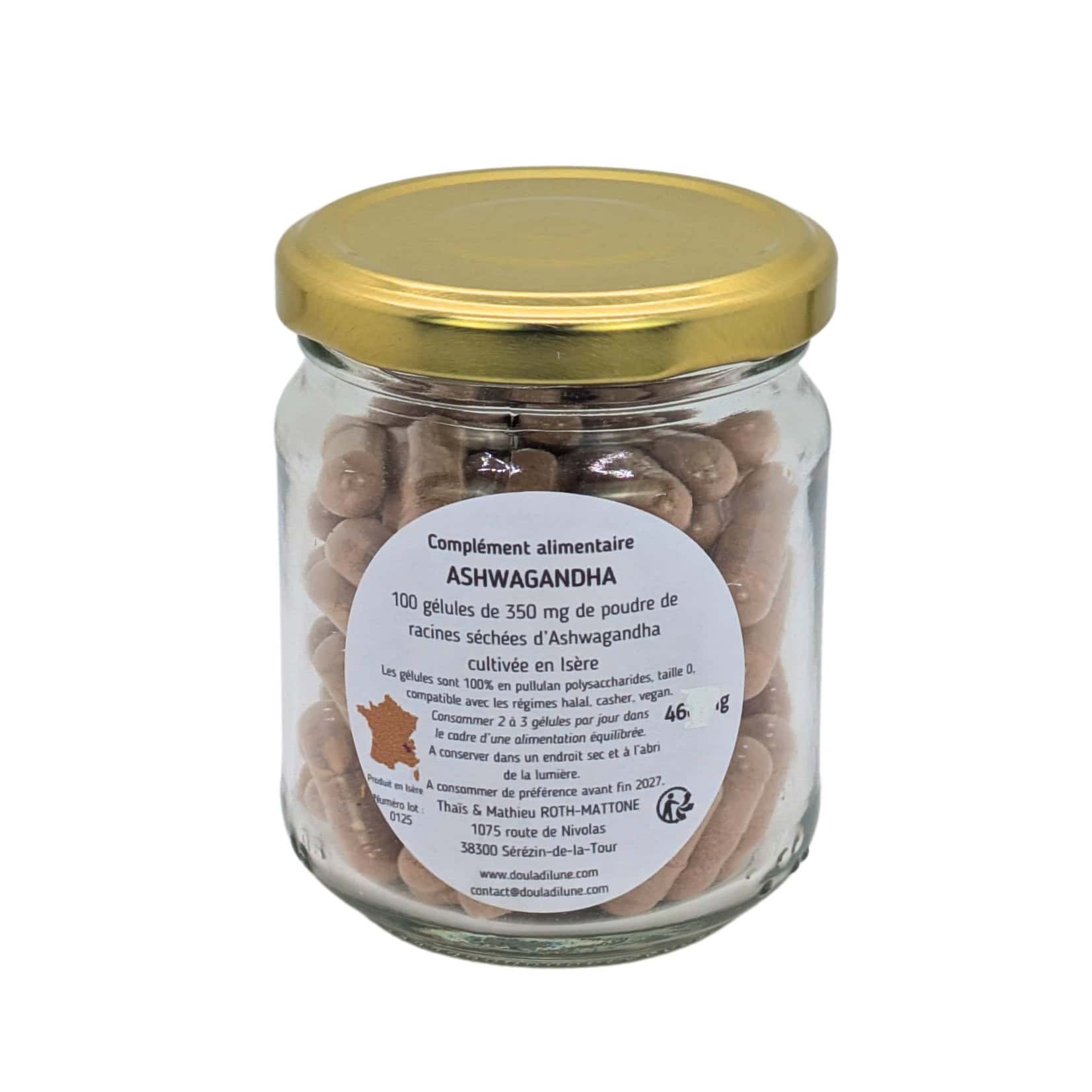 Gélules d’ashwagandha (Withania somnifera), cultivée, séchée puis transformée par nos soins, en Isère. Traçabilité garantie, de la graine à la gélule.