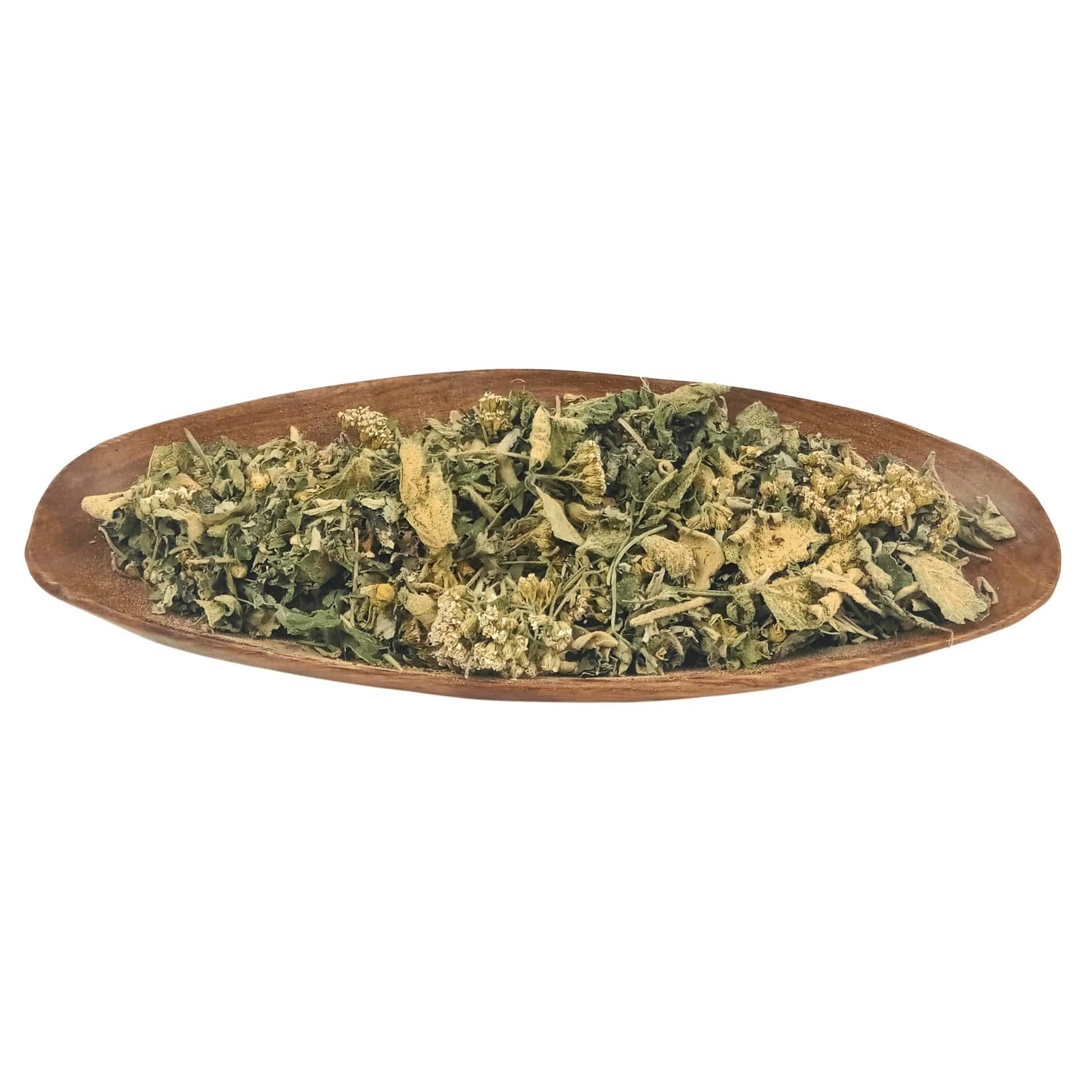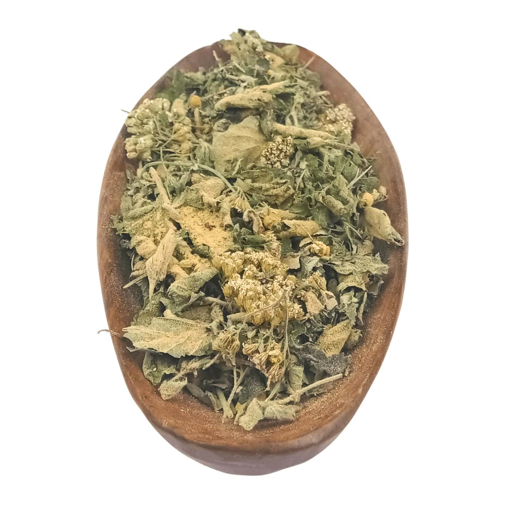 Framboisier (feuilles), Camomille matricaire, Gingembre, Ortie, Sauge, Achillée millefeuille, Romarin, Mélisse officinale