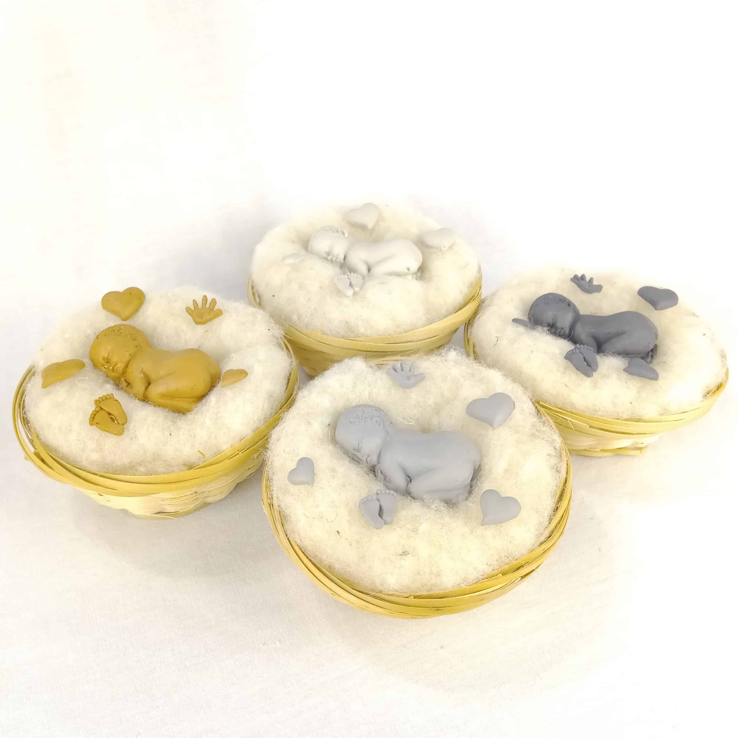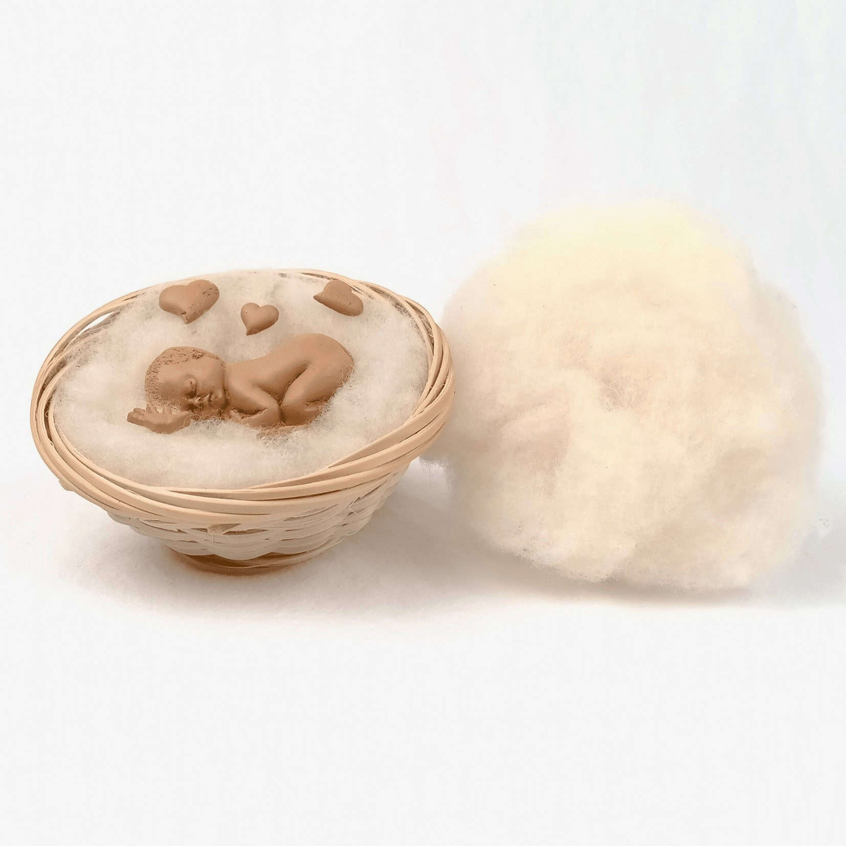 1 Écrin en osier avec un tout petit bébé symbolique, en argile crue, dans un nid douillet de laine vierge. La corbeille fait 10×4 cm