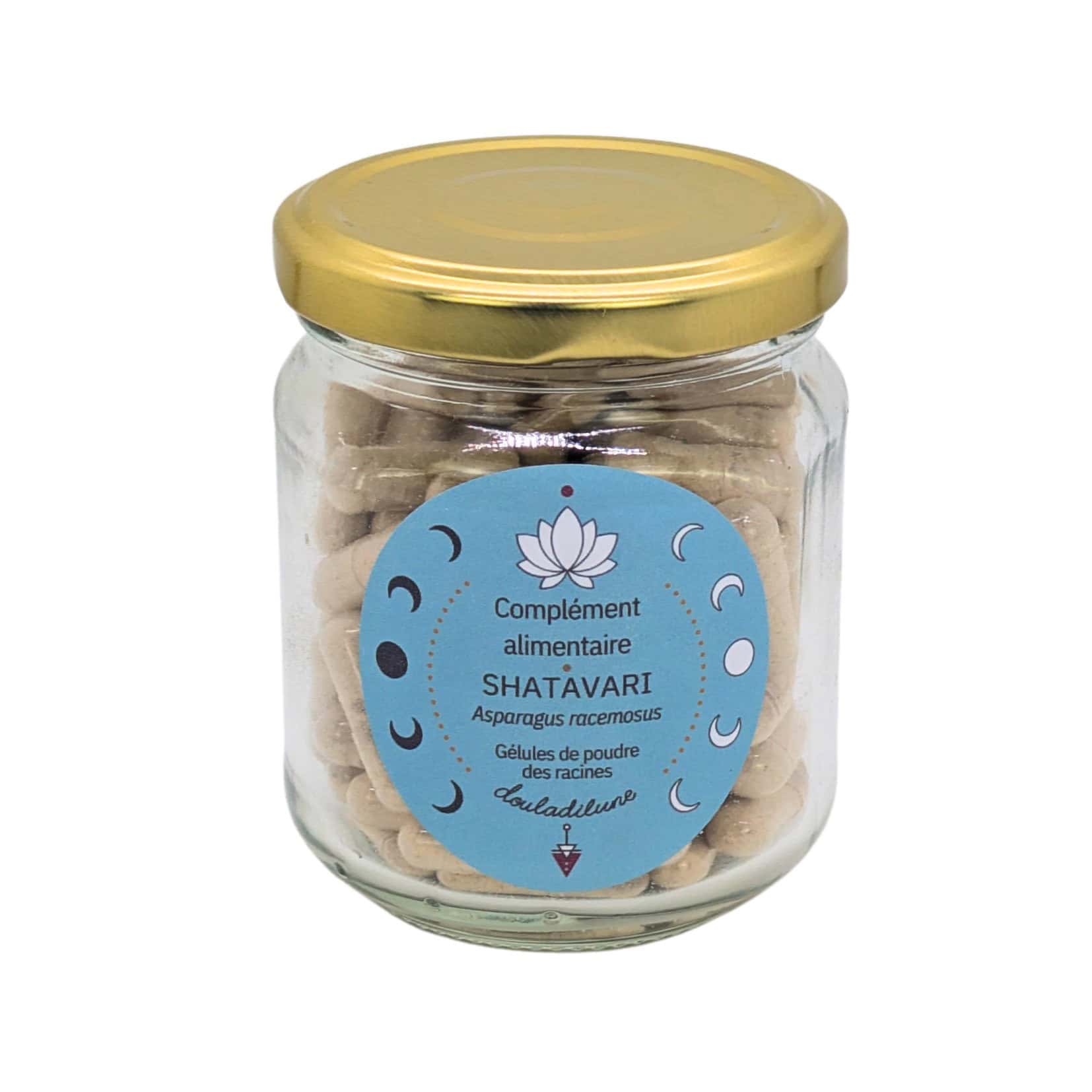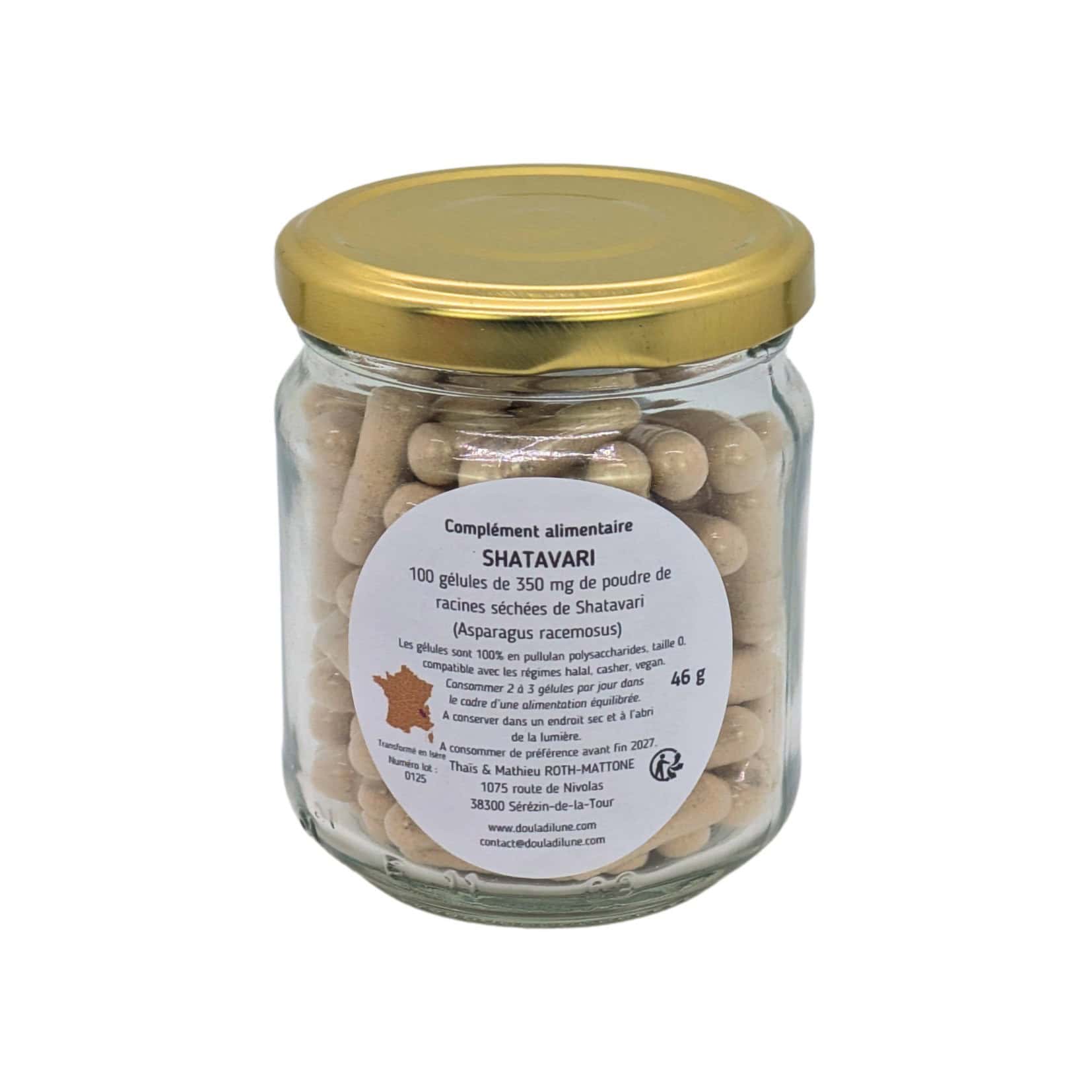 - Poudre de racines de Shatavari (Asparagus racemosus) : 350 mg par gélule, certifiée bio.
