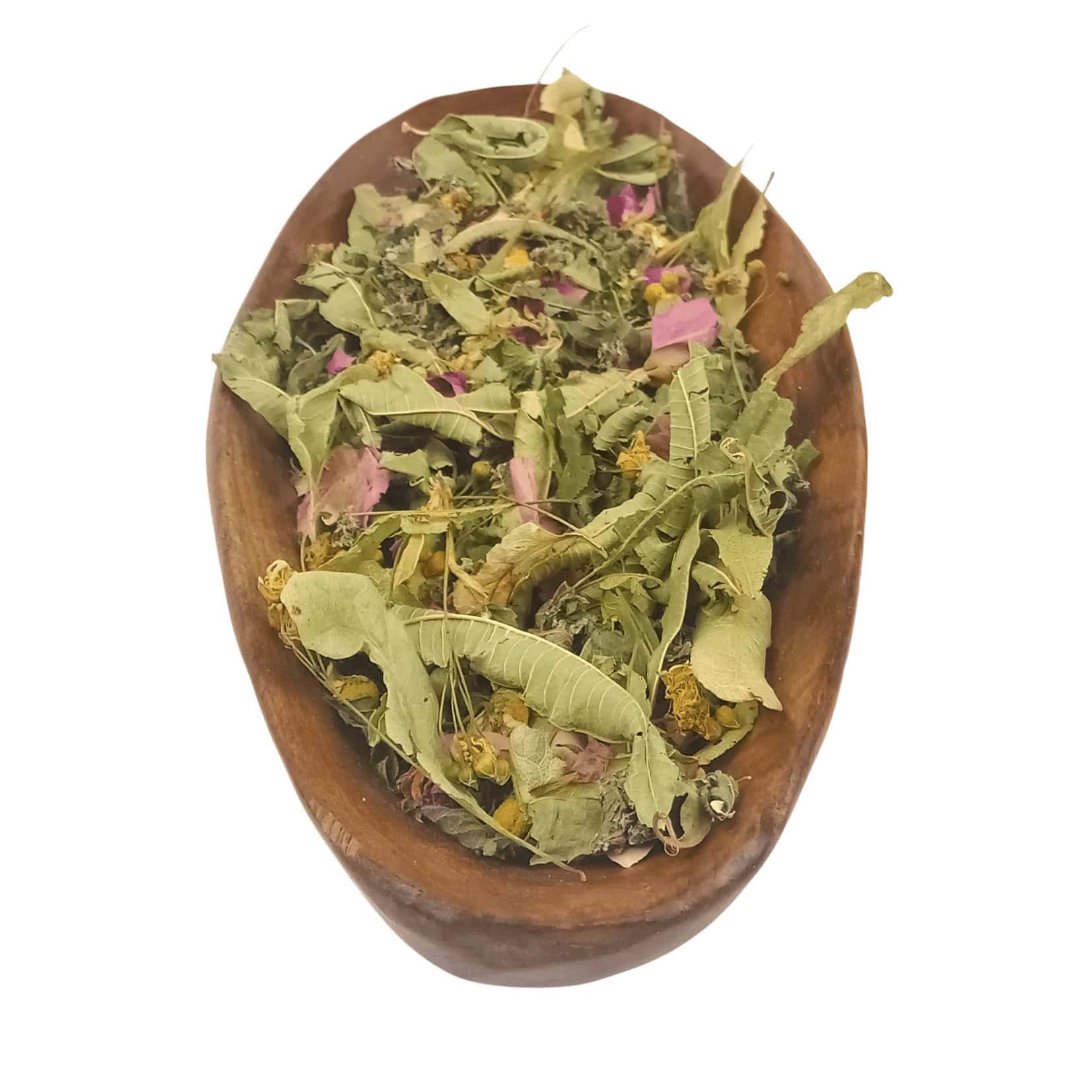 Cynorhodon, Camomille Matricaire, Framboisier (feuilles), Tilleul (fleurs), Ortie, Rose de Damas (pétales), Verveine citronnelle, Mélisse officinale